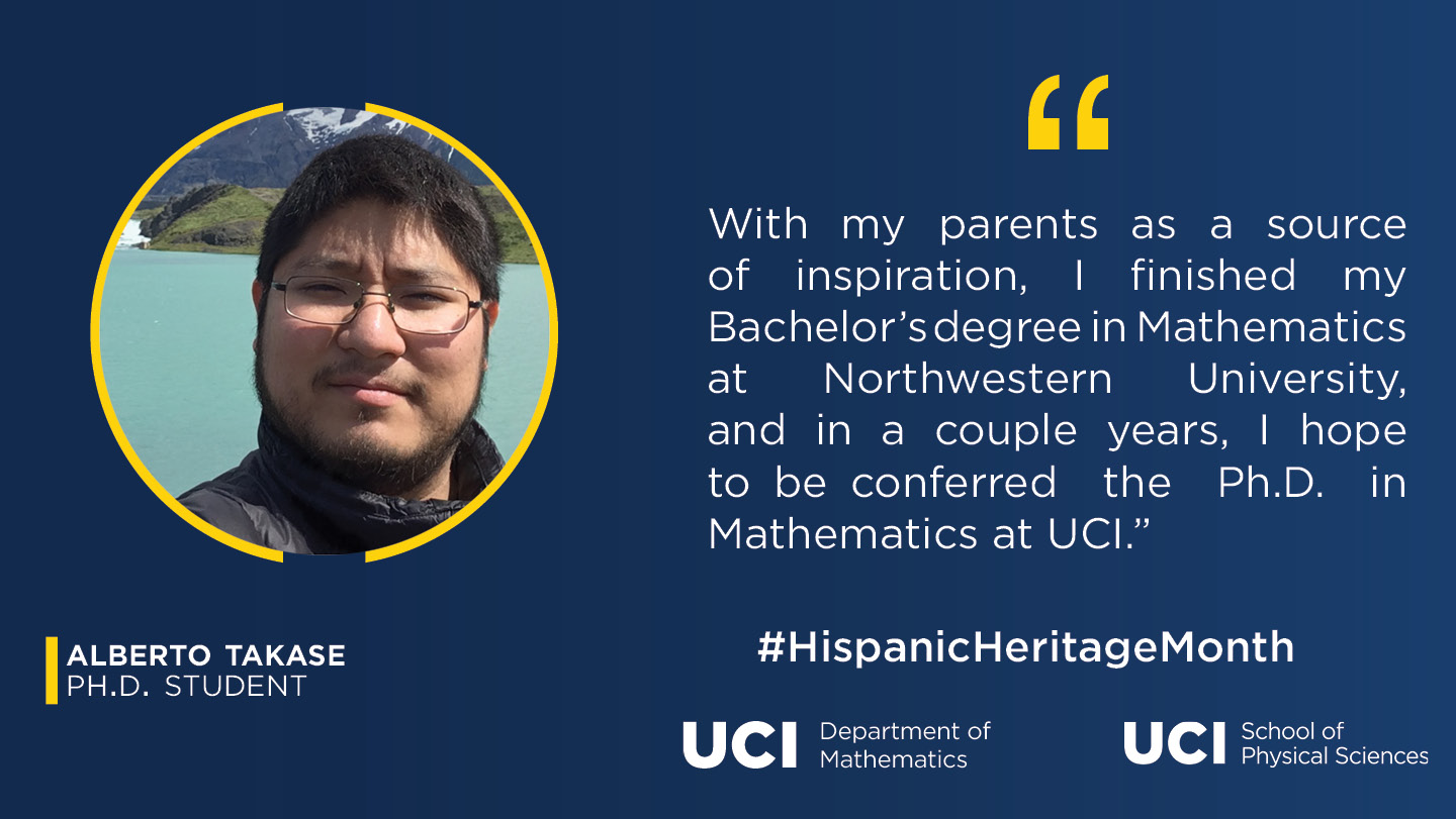 AT: Hello, my name is Alberto Takase. I’m a fifth-year Ph.D. mathematics student at UCI. My family immigrated to the Chicago-land area from Peru when I was three years old. I grew up in Illinois, and I’m a recent Californian. Growing up, I learned Spanish at home, and I learned English at school. However, I did not have anyone to teach me about higher education and its many nuances. Even so, I’m very grateful for the sacrifices and efforts my parents went through to be able to always provide food, a bed, clothes, warm showers, and much more.