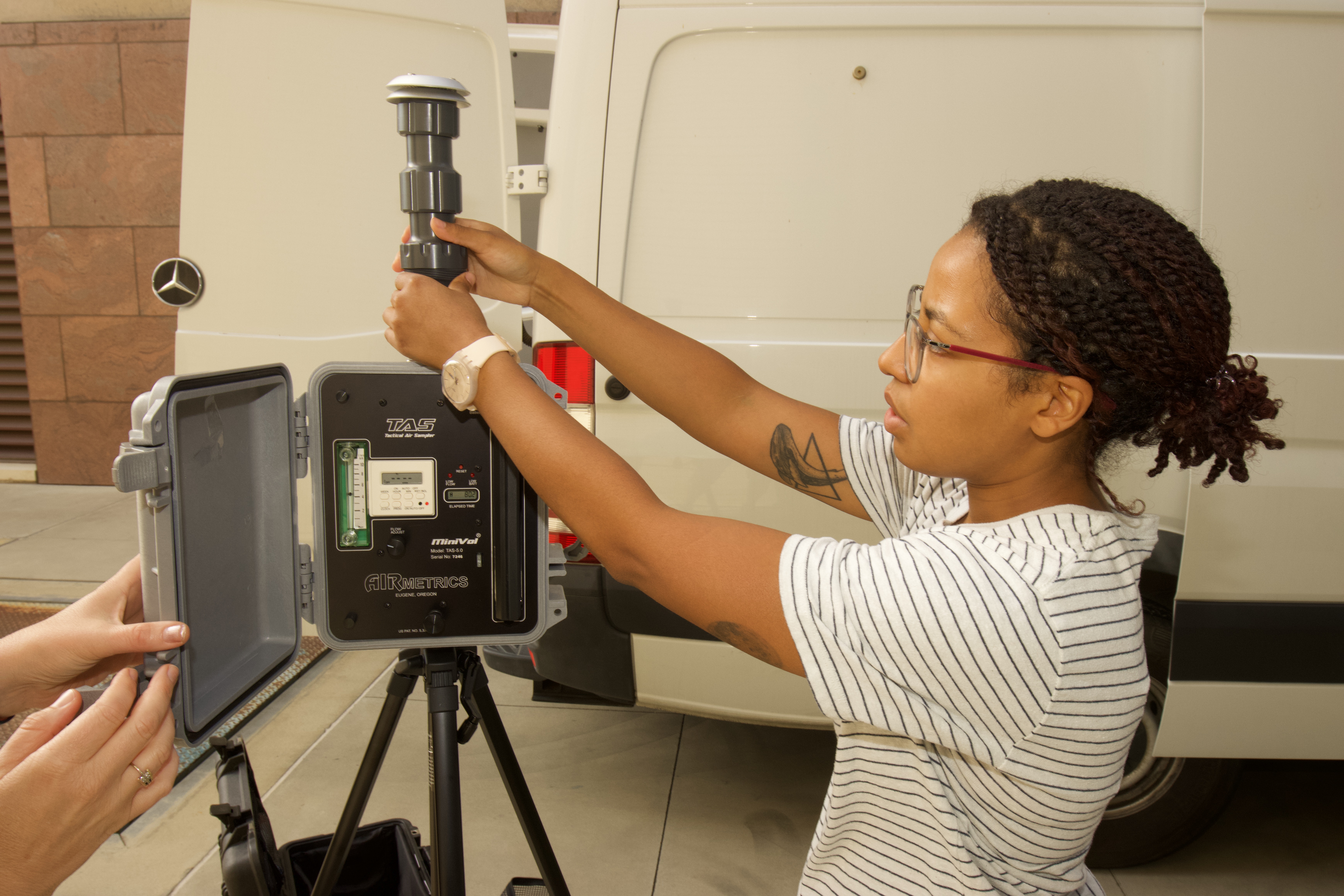 Ph.D. student Audrey Odwuor, along with UCI Department of Earth System Science Professor Claudia Czimczik, is sampling the smoke billowing from the Caldor Fire in Lake Tahoe with a filter like this one.