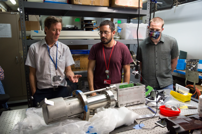 Professor Heidbrink (left) tours the DIII-D tokamak fusion reactor in San Diego and inspected component parts of the reactor.