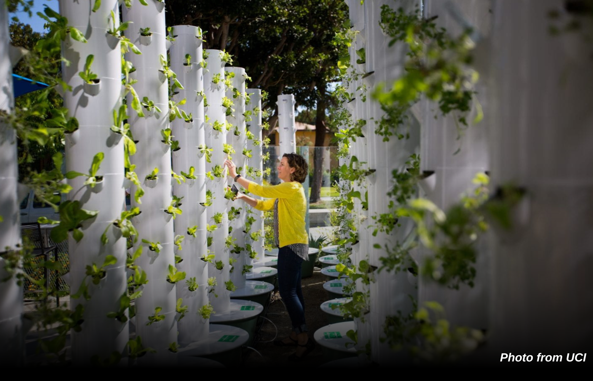 UCI also built an aeroponic garden on the patio of The Anteatery. Here, staff members are growing leafy greens and herbs served at the food hall. This method uses much less water – 90 percent less than traditional farming – and the plants grow two to three times faster, producing up to 10 times more food in the same space.