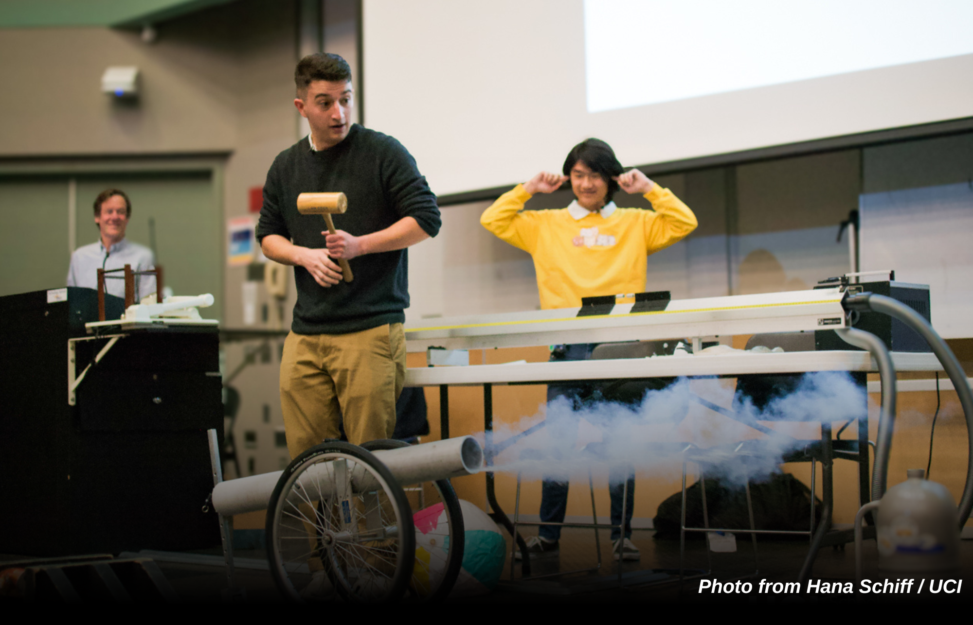 Last Saturday, in the Physical Sciences Lecture Hall, UC Irvine’s Noah Hinojos stood over a small metal cannon. Hinojos, who’s a research and development engineer in the Department of Physics & Astronomy, gripped a large wooden mallet and started hammering a plastic bottle into the cannon’s mouth.