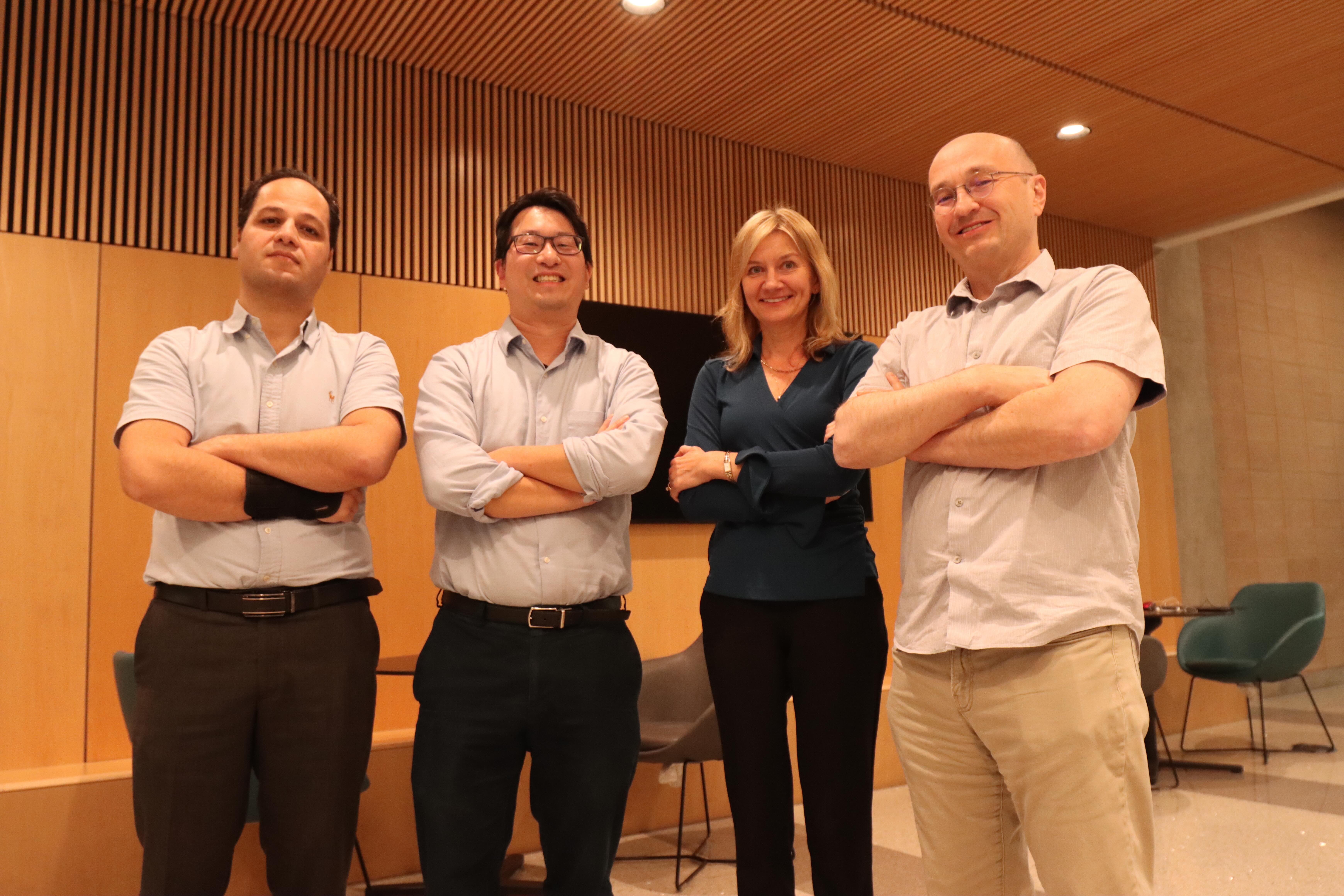 UC Irvine Physical Sciences' Professor Howard Lee (second from left) alongside his award co-principle investigators. From right: Professor Ilya Krivorotov (UC Irvine Physical Sciences), Professor Zuzanna Siwy (UC Irvine Physical Sciences), Professor Lee and Professor Rahim Esfandyarpour (UC Irvine Engineering). Not pictured: Professor Camilo Velez Cuervo (UC Irvine Engineering).