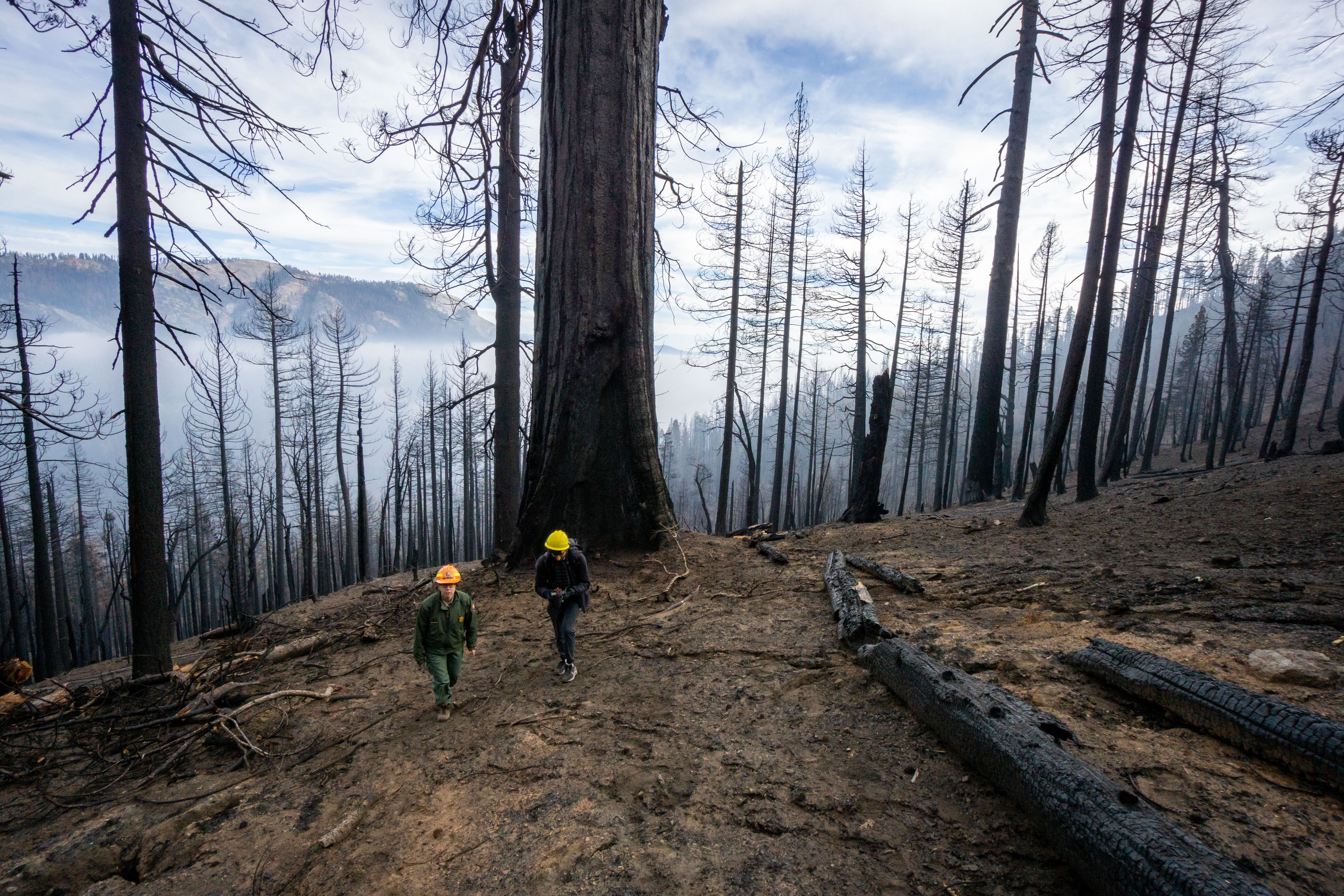 Two natural resource specialists walk through an area of Redwood Mountain Grove burned in the KNP Complex Fire in California’s Sierra Nevada Mountains to evaluate fire effects.